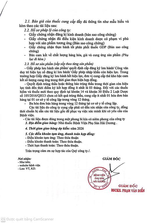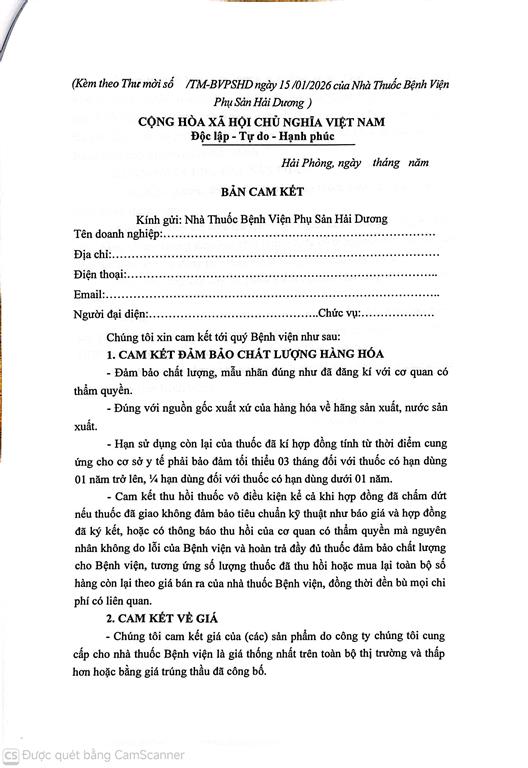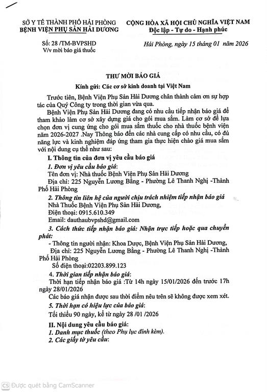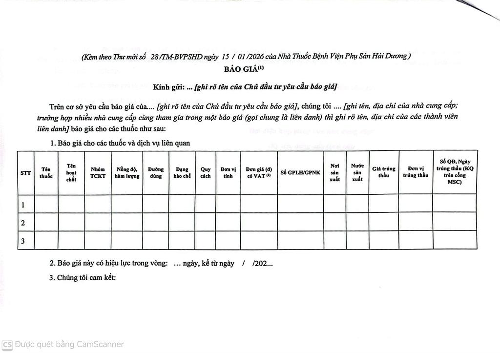 Thư mời báo giá gói thầu: Mua thực phẩm lợi sữa cho nhà thuốc Bệnh viện Phụ sản Hải Dương năm 2026-2027