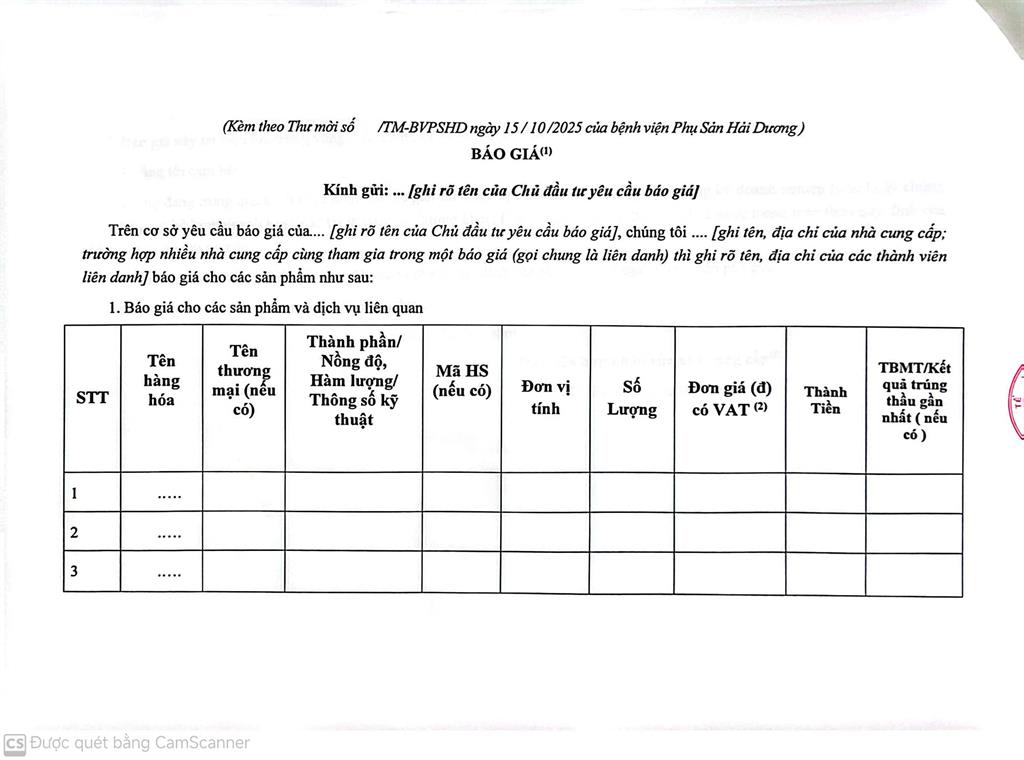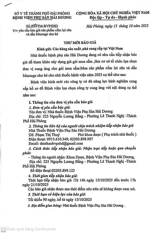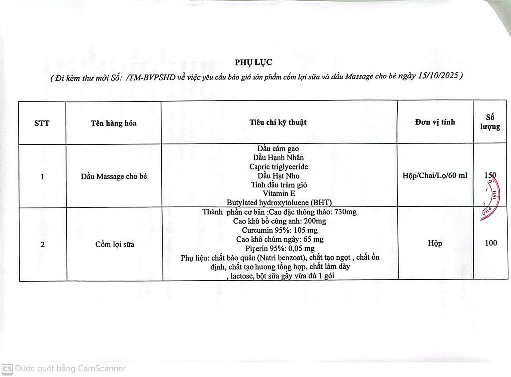 Thư mời báo giá gói mua sắm: mua sản phẩm cốm lợi sữa và dầu massage cho bé cho nhà thuốc bệnh viện năm 2025