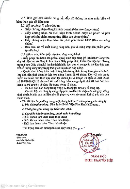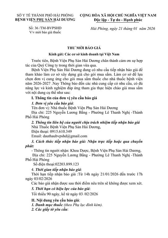 Thư mời báo giá gói thầu: Mua thực phẩm lợi sữa cho nhà thuốc Bệnh viện Phụ sản Hải Dương năm 2026-2027