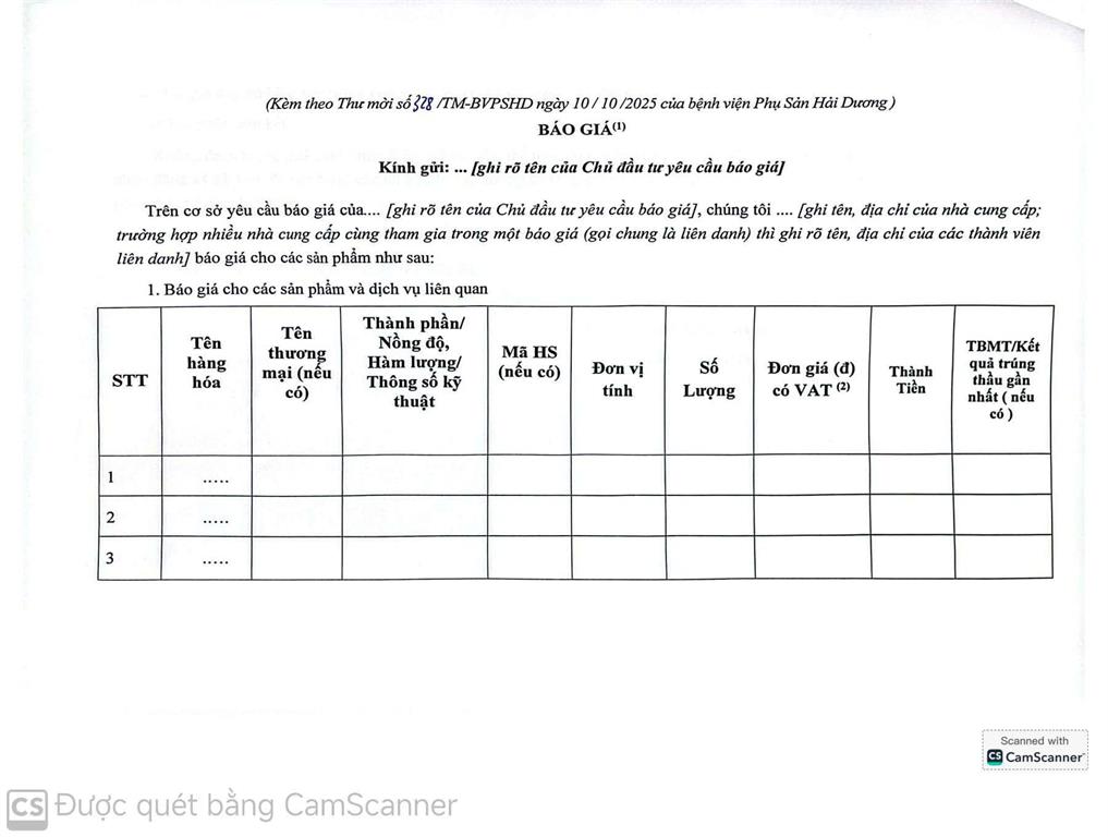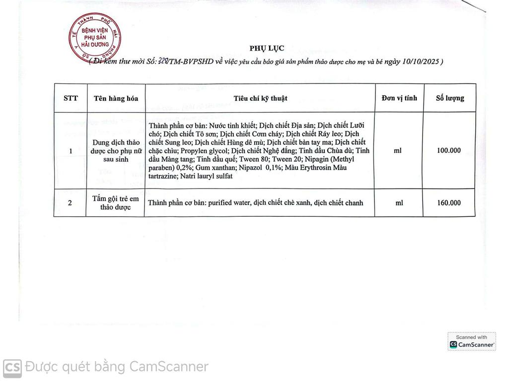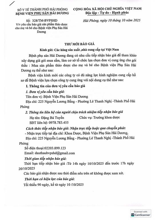 Thư mời báo giá gói thầu: Mua sản phẩm thảo dược cho mẹ và bé cho BVPS Hải Dương năm 2025