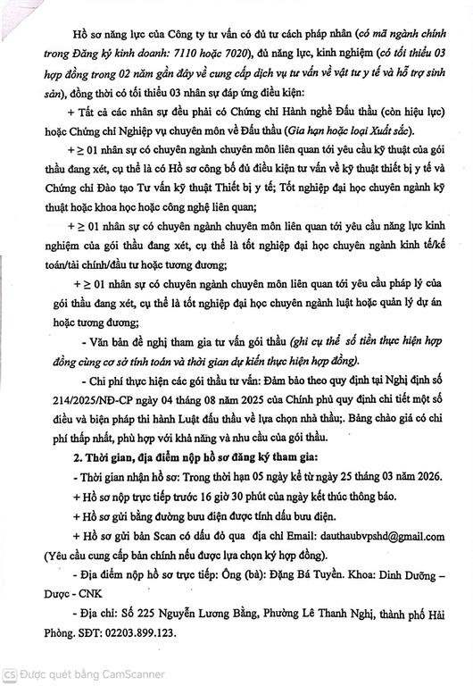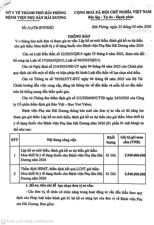 Thông báo mời đơn vị tham gia tư vấn: Lập hồ sơ mời thầu; đánh giá hồ sơ dự thầu cho gói thầu: Mua thiết bị y tế dạng thuốc cho Bệnh viện Phụ Sản Hải Dương năm 2026